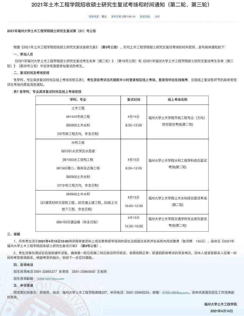 据悉,福州大学2021年土木工程学院招收硕士研究生复试考场和时间通知(第二轮、第三轮)已公布,聚创福州大学考研网汇总信息如下: