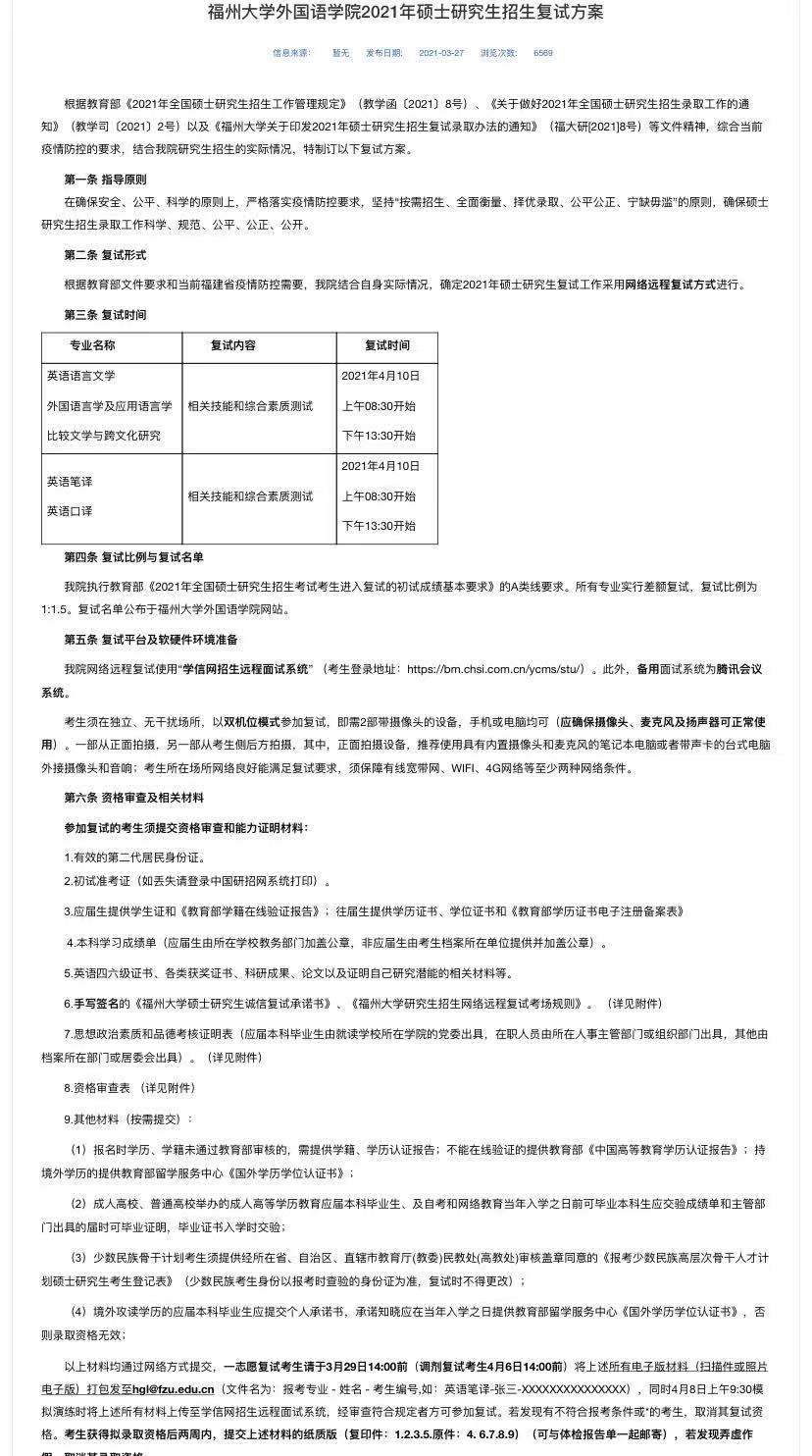 据悉,福州大学外国语学院2021年硕士研究生招生复试方案已公布,聚创福州大学考研网汇总信息如下: