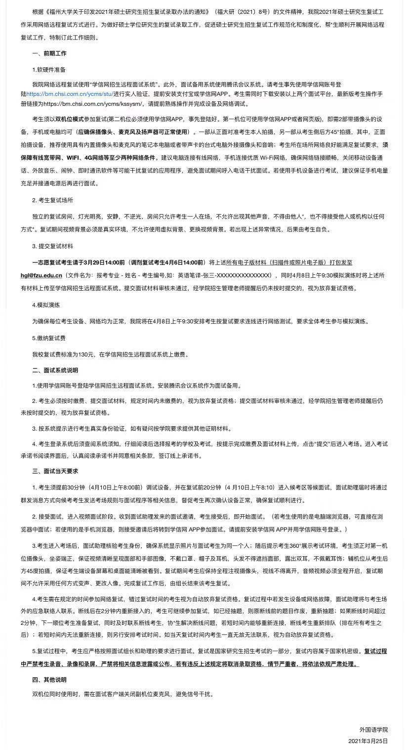 以上是聚创考研网为考生整理的"福州大学外国语学院2021年硕士研究生招生网络远程复试工作细则"的相关考研信息,希望对大家考研备考有所帮助!