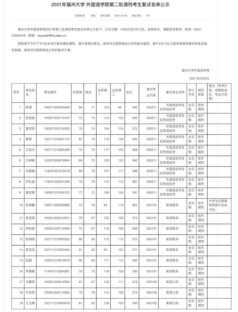 据悉,2021年福州大学外国语学院第二批调剂考生复试名单公示已公布,聚创福州大学考研网汇总信息如下: