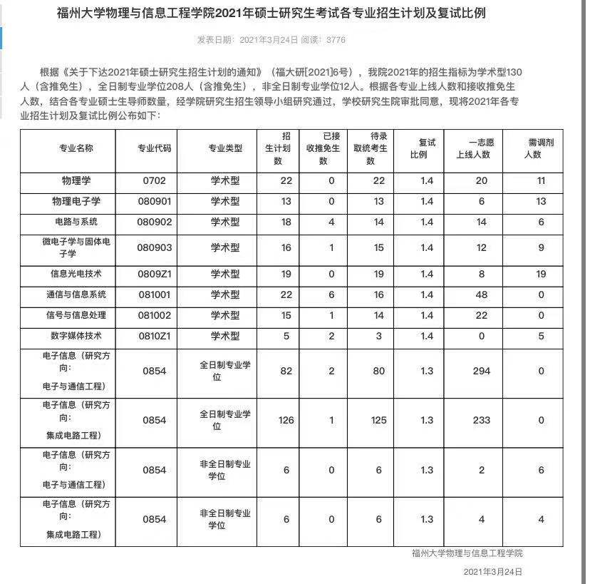 据悉,福州大学物理与信息工程学院2021年硕士研究生考试各专业招生计划及复试比例已公布,聚创福州大学考研网汇总信息如下: