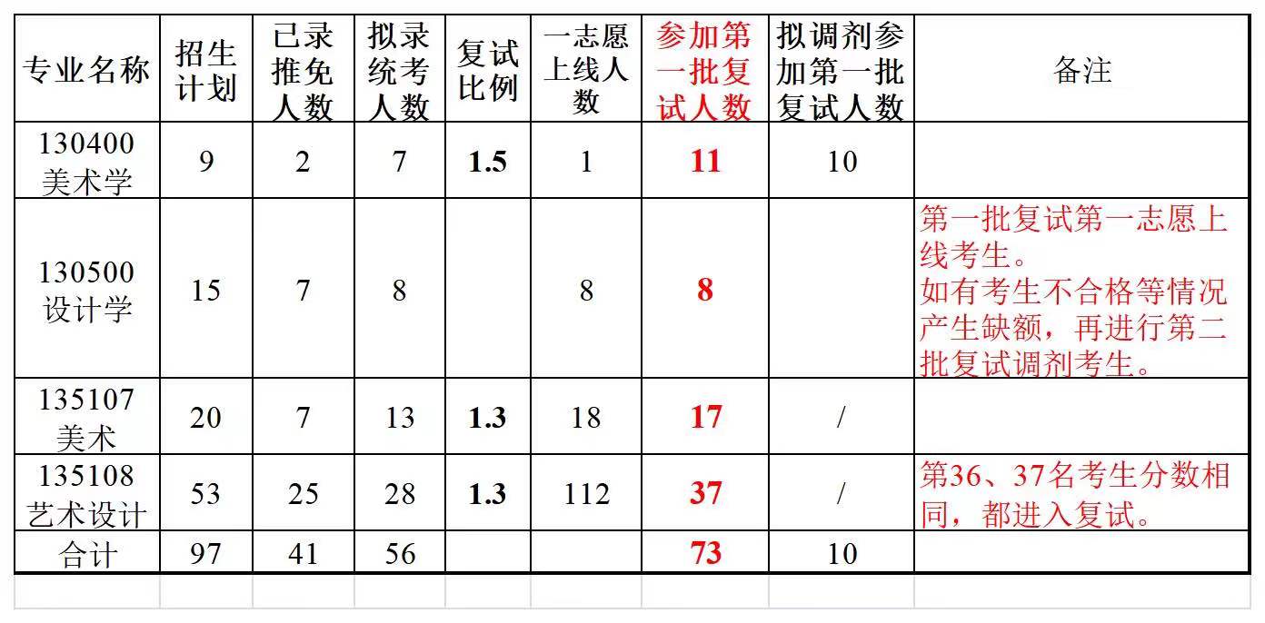 所有专业实行差额复试。复试比例为1:1.3至1:1.5之间,小数点部分采取四舍五入法。美术学一志愿合格生源低于招生计划的专业,按1:1.5复试比例,同批复试一志愿考生和调剂考生。设计学一志愿合格生源等于招生计划,先复试一志愿考生,复试后如有缺额,再按余下指标差额(复试比例1:1.5)进行第二轮复试调剂考生。设计学如有第二轮复试,将在我院网站上予以公告。