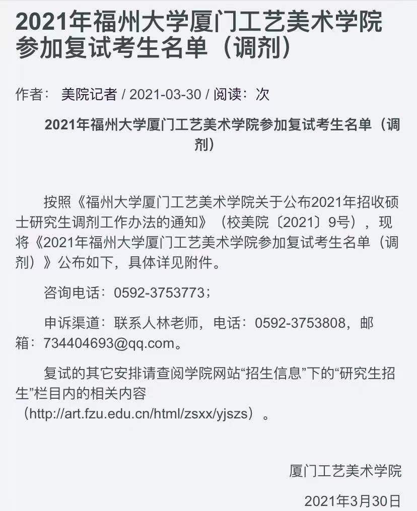 以上是聚创考研网为考生整理的"2021年福州大学厦门工艺美术学院参加复试考生名单(调剂)"的相关考研信息,希望对大家考研备考有所帮助!