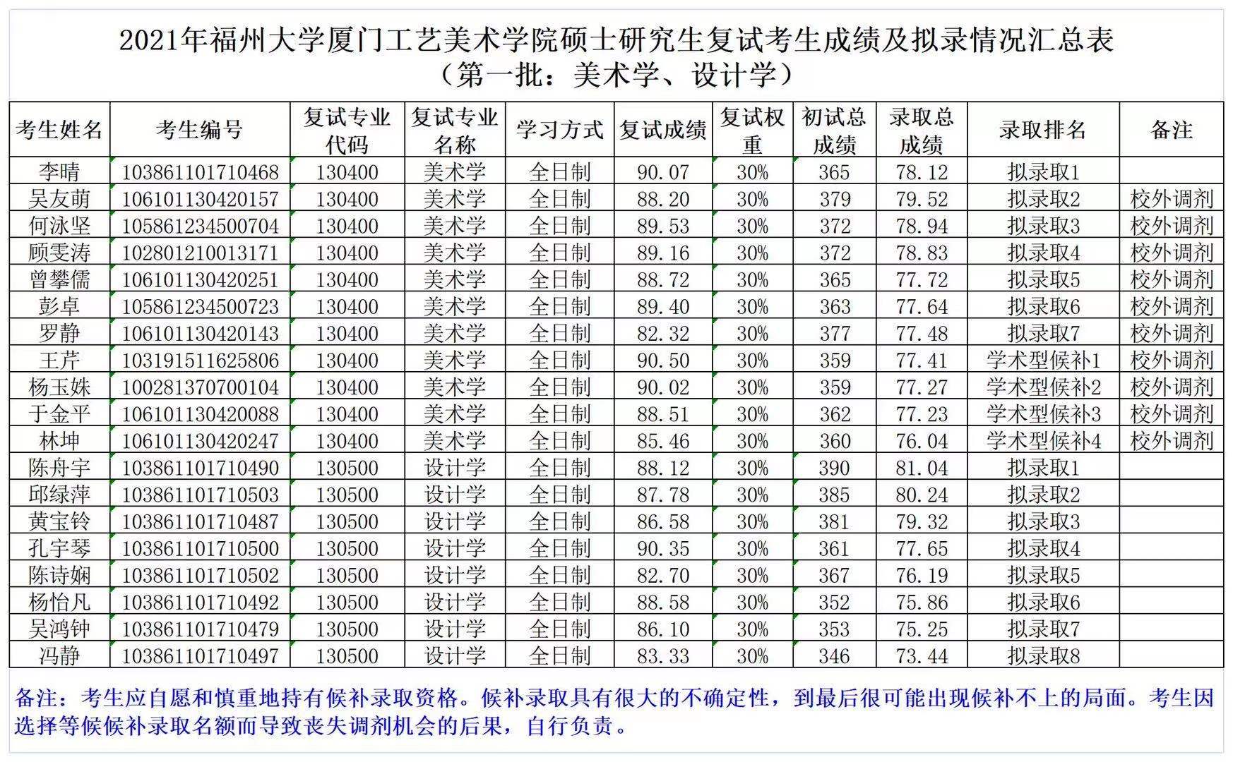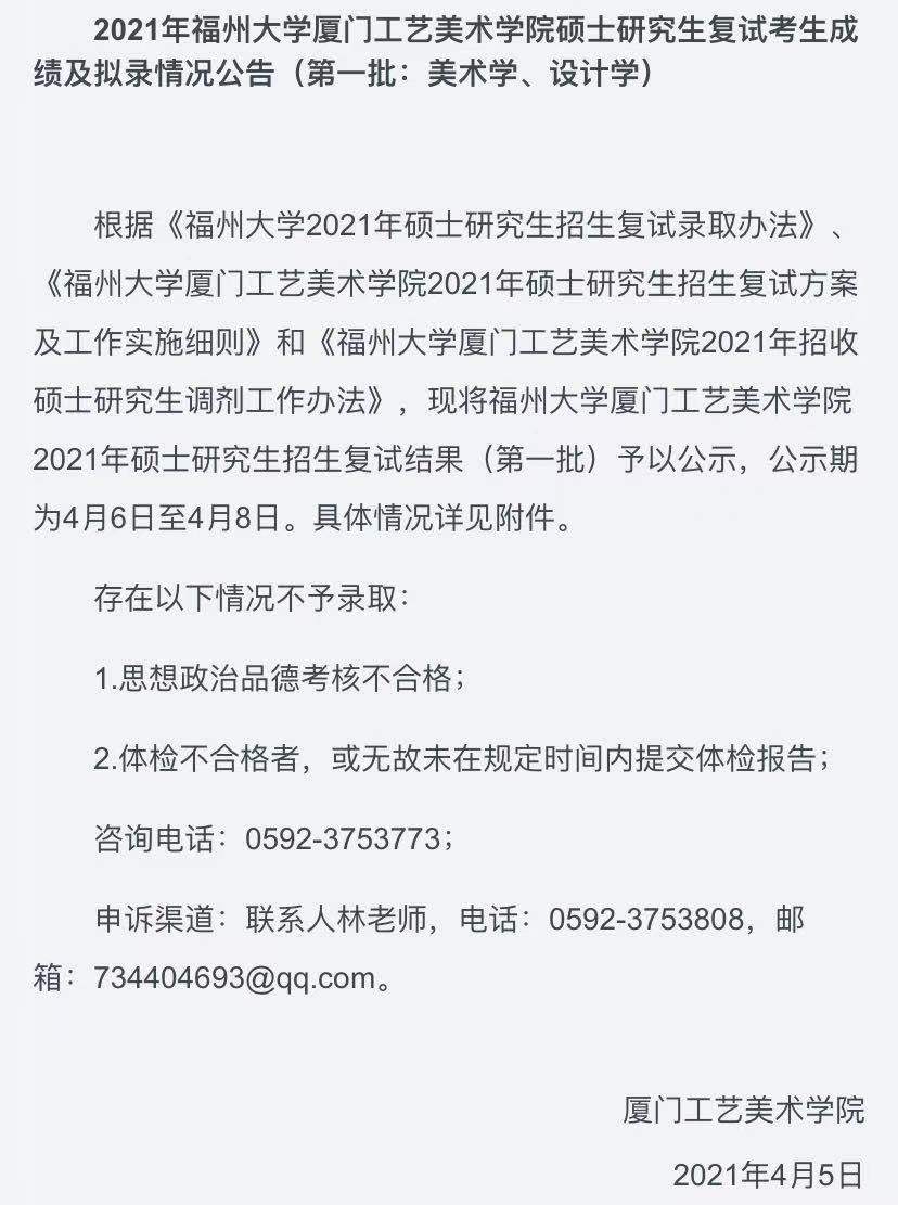 以上是聚创考研网为考生整理的"2021年福州大学厦门工艺美术学院硕士研究生复试考生成绩及拟录情况公告(第一批:美术学、设计学)"的相关考研信息,希望对大家考研备考有所帮助!