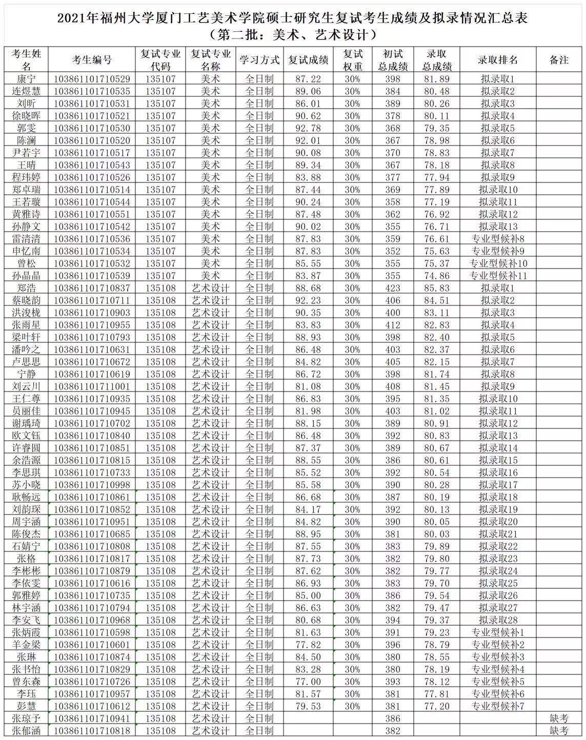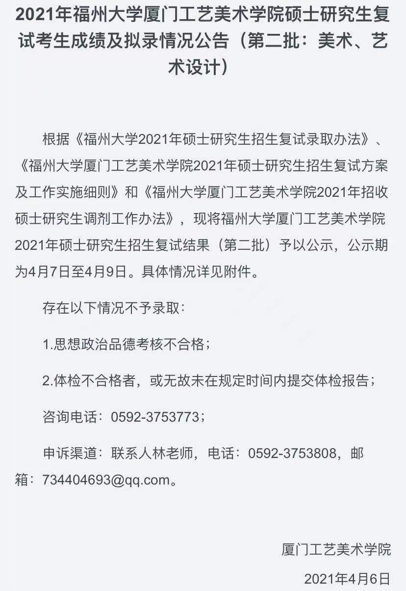 据悉,2021年福州大学厦门工艺美术学院硕士研究生复试考生成绩及拟录情况公告(第二批:美术、艺术设计)已公布,聚创福州大学考研网汇总信息如下: