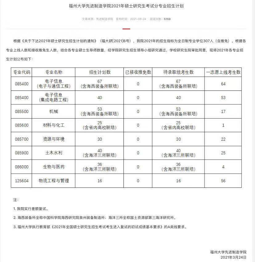 据悉,福州大学先进制造学院2021年硕士研究生考试分专业招生计划已公布,聚创福州大学考研网汇总信息如下: