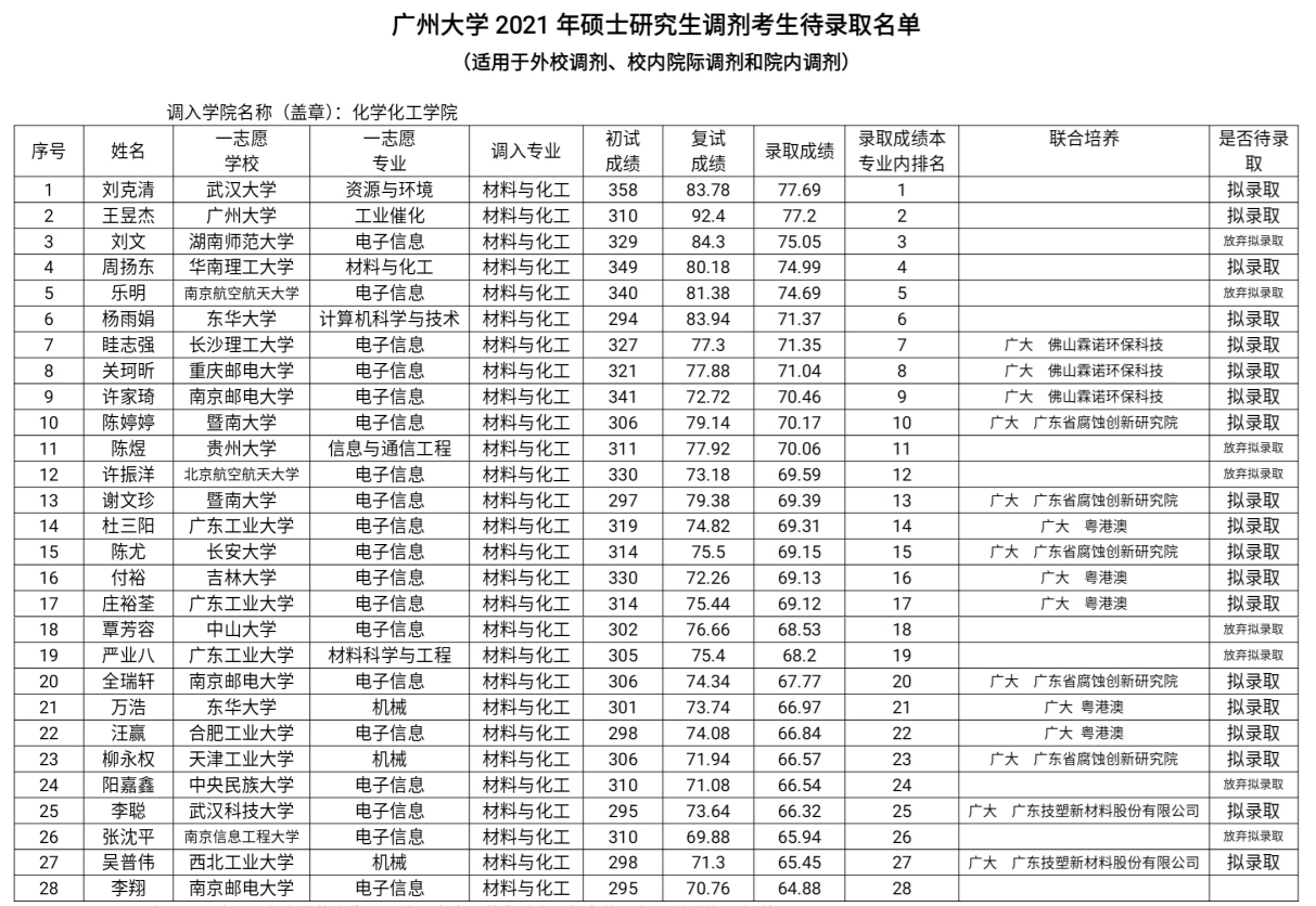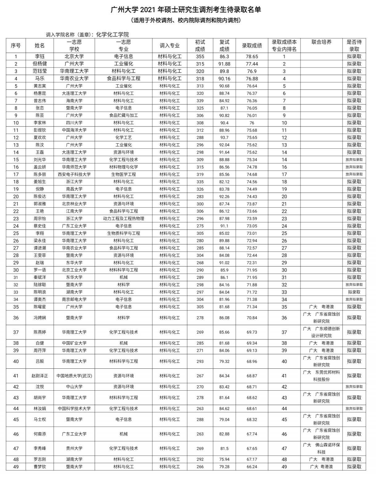 以上是聚创考研网为考生整理的"广州大学化学化工学院2021年招收硕士研究生调剂考生待录取名单公示"的相关考研信息,希望对大家考研备考有所帮助!