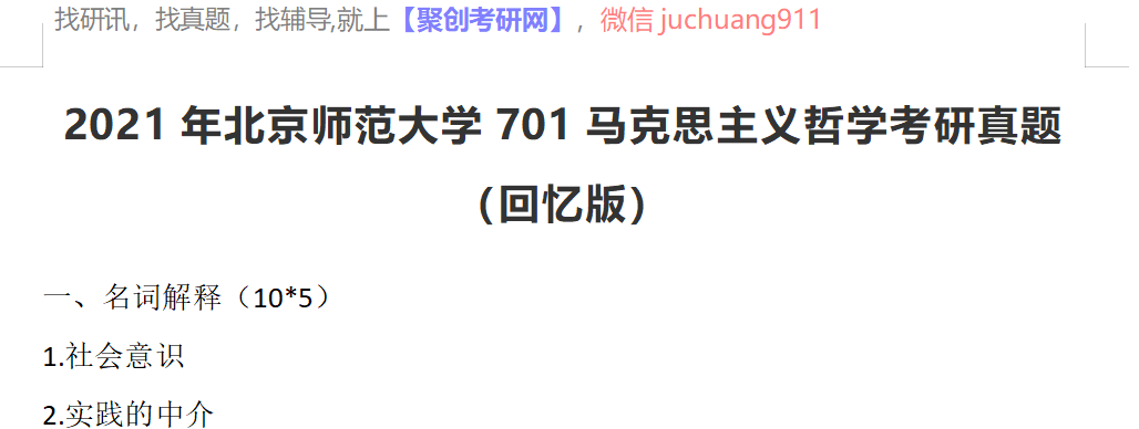 以上是聚创考研网为考生整理的"2021年北京师范大学701马克思主义哲学考研真题(回忆版)"的相关考研信息,希望对大家考研备考有所帮助! 备考过程中如有疑问,也可以添加老师微信juchuang911进行咨询。