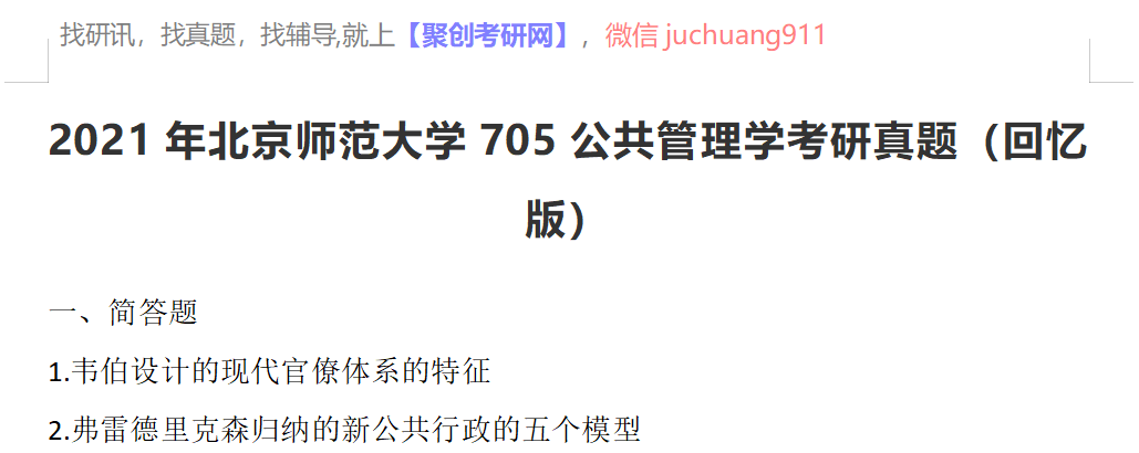 以上是聚创考研网为考生整理的"2021年北京师范大学705公共管理学考研真题(回忆版)"的相关考研信息,希望对大家考研备考有所帮助! 备考过程中如有疑问,也可以添加老师微信juchuang911进行咨询。