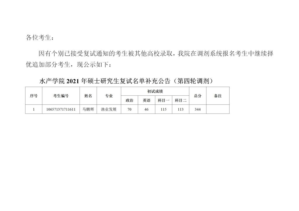 以上是聚创考研网为考生整理的"集美大学水产学院2021年硕士研究生复试名单补充公告(第四轮调剂)"的相关考研信息,希望对大家考研备考有所帮助!