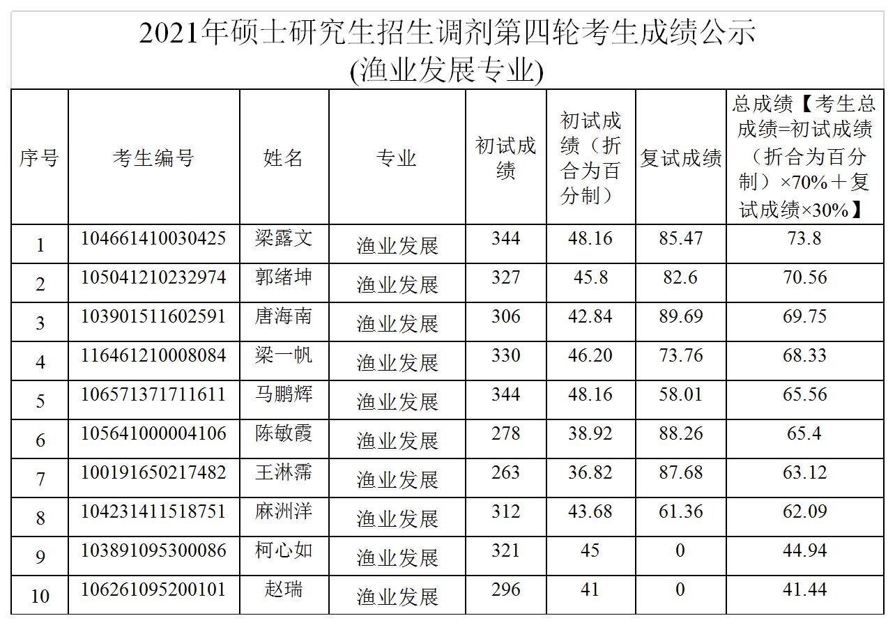 以上是聚创考研网为考生整理的"集美大学水产学院2021年硕士研究生招生调剂第四轮考生成绩公示(渔业发展专业)"的相关考研信息,希望对大家考研备考有所帮助!
