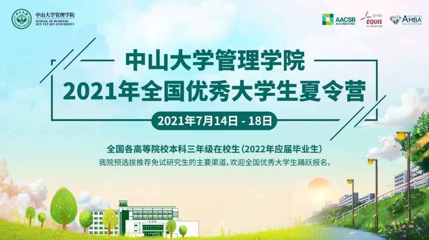 为促进全国优秀大学生之间的交流,增进对中山大学管理学院的了解,激发青年学子的学习和研究兴趣,选拔优秀学生继续深造,我院将于2021年7月14日至18日采取线上方式举办“中山大学管理学院2021年全国优秀大学生夏令营”活动。在夏令营中表现优秀且符合我校推免要求的营员,将有机会成为我院2022级硕士研究生(含硕博连读生和专业型硕士)或直博生。