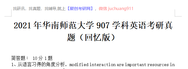 以上是聚创考研网为考生整理的"2021年华南师范大学907学科英语考研真题(回忆版)"的相关考研信息,希望对大家考研备考有所帮助! 备考过程中如有疑问,也可以添加老师微信juchuang911进行咨询。