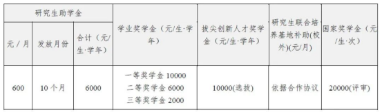 所有非定向就业全日制硕士研究生可享受奖助学金。奖助体系执行学校有关政策,主要有研究生助学金、研究生学业奖学金、研究生国家奖学金、优秀研究生干部及研究生单项奖学金、创新拔尖人才培育计划等。奖励办法如下表: