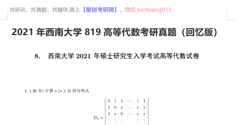 以上是聚创考研网为考生整理的"2021年西南大学819高等代数考研真题(回忆版)"的相关考研信息,希望对大家考研备考有所帮助! 备考过程中如有疑问,也可以添加老师微信juchuang911进行咨询。