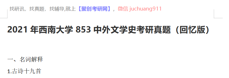 以上是聚创考研网为考生整理的"2021年西南大学853中外文学史考研真题(回忆版)"的相关考研信息,希望对大家考研备考有所帮助! 备考过程中如有疑问,也可以添加老师微信juchuang911进行咨询。