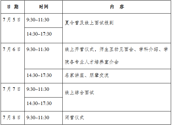 本次夏令营将对学生进行全面考核,考核方式为网络综合面试,包括思想政治素质和品德、综合素质、外国语水平测试、专业课面试等。