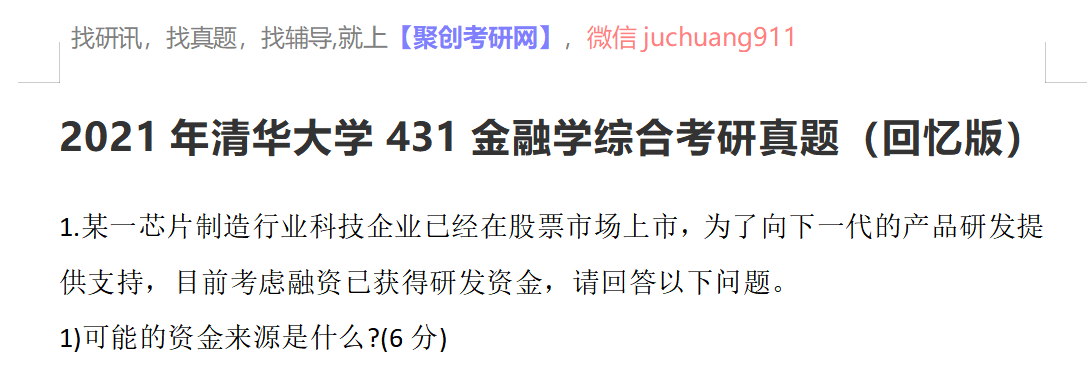 以上是聚创考研网为考生整理的"2021年清华大学431金融学综合考研真题(回忆版)"的相关考研信息,希望对大家考研备考有所帮助! 备考过程中如有疑问,也可以添加老师微信juchuang911进行咨询。