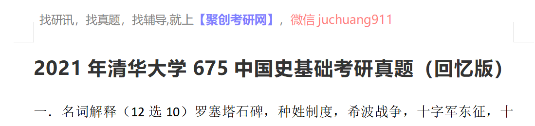 以上是聚创考研网为考生整理的"2021年清华大学675中国史基础考研真题(回忆版)"的相关考研信息,希望对大家考研备考有所帮助! 备考过程中如有疑问,也可以添加老师微信juchuang911进行咨询。