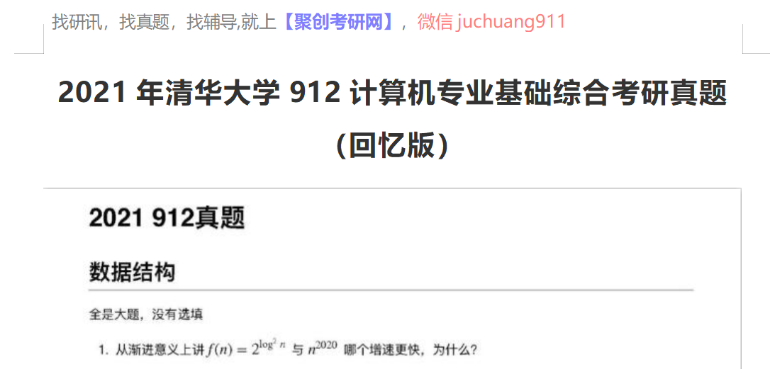 以上是聚创考研网为考生整理的"2021年清华大学912计算机专业基础综合考研真题(回忆版)"的相关考研信息,希望对大家考研备考有所帮助! 备考过程中如有疑问,也可以添加老师微信juchuang911进行咨询。