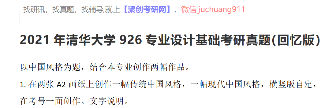 以上是聚创考研网为考生整理的"2021年清华大学926专业设计基础考研真题(回忆版)"的相关考研信息,希望对大家考研备考有所帮助! 备考过程中如有疑问,也可以添加老师微信juchuang911进行咨询。
