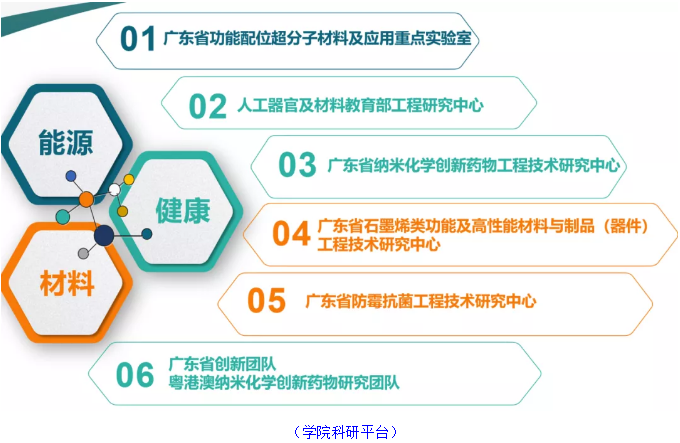 学院还拥有众多良好的科研平台,包括广东省功能配位超分子材料及应用重点实验室、人工器官及材料教育部工程研究中心、广东省纳米化学创新药物工程技术研究中心、广东省石墨烯类功能及高性能材料与制品(器件)工程技术研究中心、广东省实验教学示范中心、材料科学与工程实验教学中心、化学实验教学中心等。
