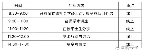 为了加强全国高校大学生对暨南大学社会学一级学科硕士点的了解,并从中选拔优秀者成为暨南大学社会学专业硕士研究生,人文学院将于2021年7月30日举办“优秀大学生暑期夏令营”活动。因受疫情影响,本次夏令营为线上举办,报名截止时间为2021年7月25日。