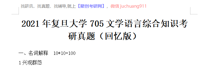 以上是聚创考研网为考生整理的"2021年复旦大学705文学语言综合知识考研真题(回忆版)"的相关考研信息,希望对大家考研备考有所帮助! 备考过程中如有疑问,也可以添加老师微信juchuang911进行咨询。