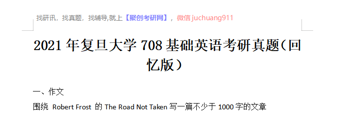 以上是聚创考研网为考生整理的"2021年复旦大学708基础英语考研真题(回忆版)"的相关考研信息,希望对大家考研备考有所帮助! 备考过程中如有疑问,也可以添加老师微信juchuang911进行咨询。