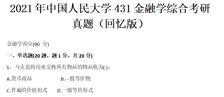 完整版请下载附件:2021年中国人民大学431金融学综合考研真题(回忆版)