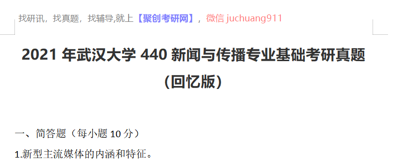 以上是聚创考研网为考生整理的"2021年武汉大学440新闻与传播专业基础考研真题(回忆版)"的相关考研信息,希望对大家考研备考有所帮助! 备考过程中如有疑问,也可以添加老师微信juchuang911进行咨询。