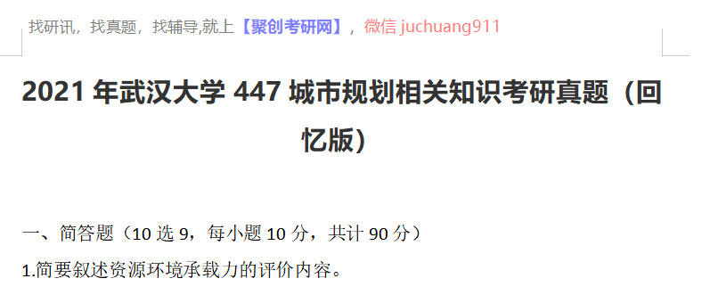 以上是聚创考研网为考生整理的"2021年武汉大学447城市规划相关知识考研真题(回忆版)"的相关考研信息,希望对大家考研备考有所帮助! 备考过程中如有疑问,也可以添加老师微信juchuang911进行咨询。