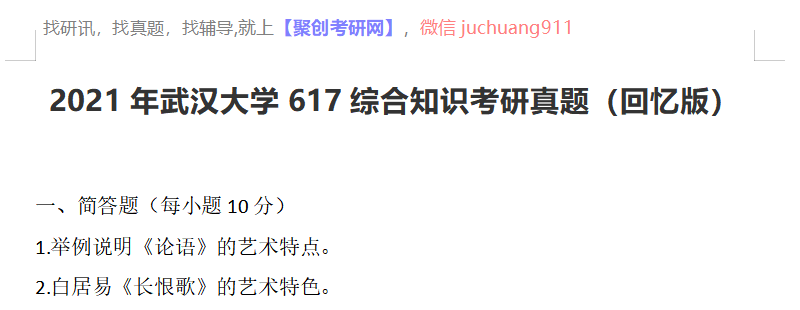 以上是聚创考研网为考生整理的"2021年武汉大学617综合知识考研真题(回忆版)"的相关考研信息,希望对大家考研备考有所帮助! 备考过程中如有疑问,也可以添加老师微信juchuang911进行咨询。
