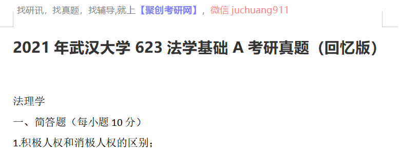 以上是聚创考研网为考生整理的"2021年武汉大学623法学基础A考研真题(回忆版)"的相关考研信息,希望对大家考研备考有所帮助! 备考过程中如有疑问,也可以添加老师微信juchuang911进行咨询。