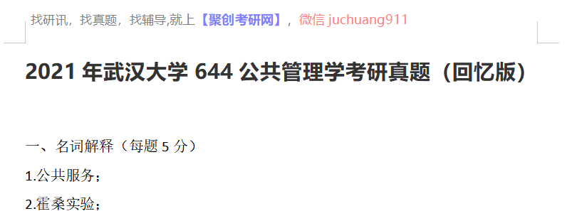 以上是聚创考研网为考生整理的"2021年武汉大学644公共管理学考研真题(回忆版)"的相关考研信息,希望对大家考研备考有所帮助! 备考过程中如有疑问,也可以添加老师微信juchuang911进行咨询。