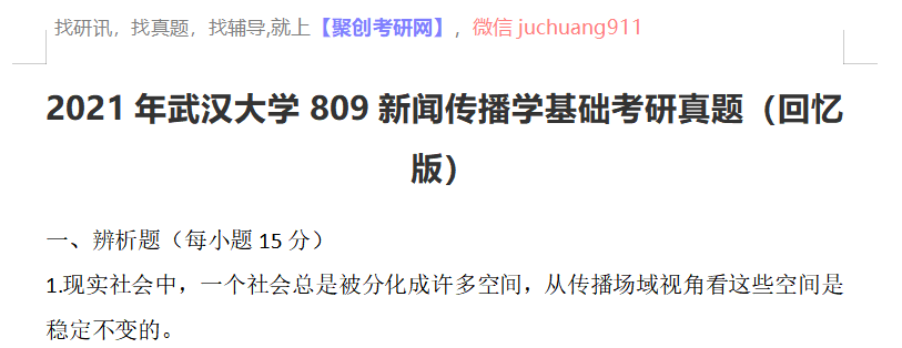 以上是聚创考研网为考生整理的"2021年武汉大学809新闻传播学基础考研真题(回忆版)"的相关考研信息,希望对大家考研备考有所帮助! 备考过程中如有疑问,也可以添加老师微信juchuang911进行咨询。