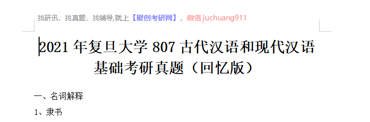 以上是聚创考研网为考生整理的"2021年复旦大学807古代汉语和现代汉语基础考研真题(回忆版)"的相关考研信息,希望对大家考研备考有所帮助! 备考过程中如有疑问,也可以添加老师微信juchuang911进行咨询。