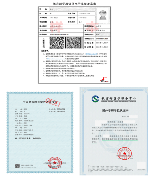 2、其他非应届本科毕业的,除上传上述“身份审核”材料外,还须上传“中国高等教育学生信息网”的《教育部学历证书电子注册备案表》或《中国高等教育学历认证报告》或《国外学历学位认证书》(三者之一均可)。其中,尚未取得本科毕业证书的自考考生和网络教育考生,仅需上传成绩单或学生证(两者或两者之一均可)。样图如下: