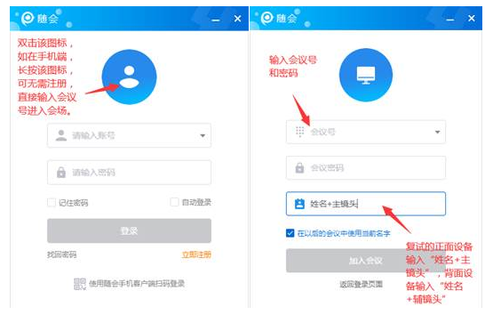 (2)在设备上打开随会,按以下说明操作填写相应信息,然后点击“加入会议”,进入等候室,等待复试秘书操作;