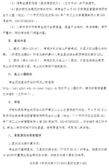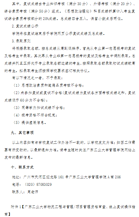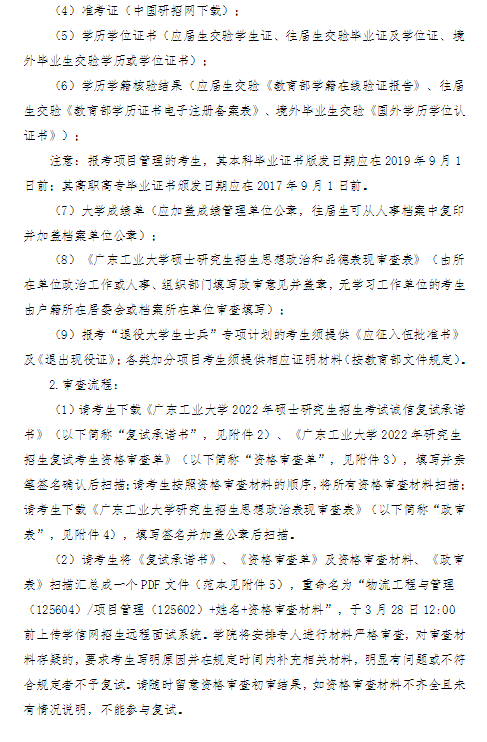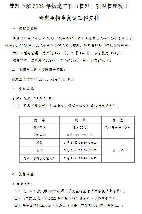 以上是聚创考研网为考生整理的"广东工业大学管理学院2022年物流工程与管理、项目管理硕士研究生招生复试工作安排"的相关考研信息,希望对大家考研备考有所帮助! 备考过程中如有疑问,也可以添加老师微信juchuang911进行咨询。