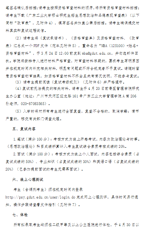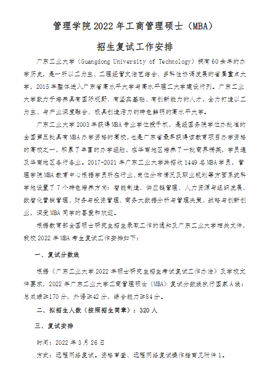 据悉,广东工业大学管理学院2022年工商管理硕士(MBA)招生复试工作安排已公布,聚创广东工业大学考研网小编为大家整理如下:
