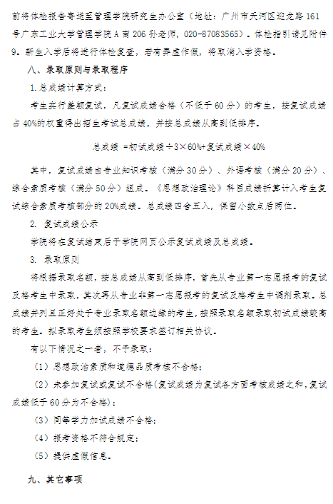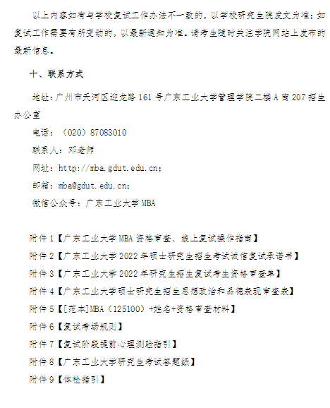 以上是聚创考研网为考生整理的"广东工业大学管理学院2022年工商管理硕士(MBA)招生复试工作安排"的相关考研信息,希望对大家考研备考有所帮助! 备考过程中如有疑问,也可以添加老师微信juchuang911进行咨询。