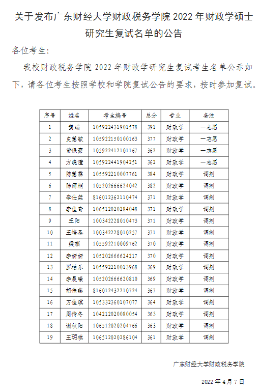 据悉,广东财经大学财政税务学院2022年财政学硕士研究生复试名单的公告已公布,聚创广东财经大学考研网小编整理如下内容: