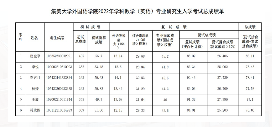 据悉,集美大学外国语学院2022年学科教学(英语)非全日制专业调剂总成绩单已公布,聚创集美大学考研小编为你整理如下内容: