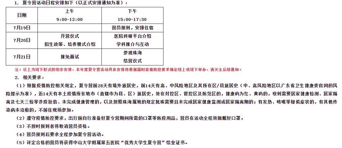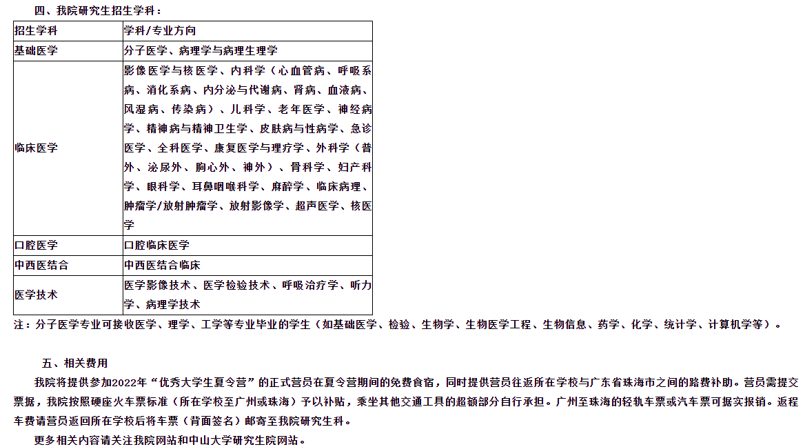 为促进国内有志于在医学领域奋斗的优秀大学生的学习和交流,促进优秀大学生了解医学前沿动态和拓展视野,增进优秀青年学生对我院 学科及研究生教育的了解,吸引优秀大学毕业生加入到我院临床和基础研究队伍,中山大学附属第五医院将于2022年7月19日-21日举办第6届 “筑梦中大 相约五院——全国优秀大学生夏令营”活动,并从中选拔优秀大学生作为推荐免试研究生,给予继续深造的机会。