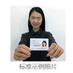 2、本人手持身份证照(注意不要上传对镜子拍摄的照片)。拍摄时,手持本人身份证,将持证的手臂和上半身整个拍进照片,头部和肩部要端正,头发不得遮挡脸部或造成阴影,要露出五官;身份证上的所有信息清晰可见、完整(没有被遮挡或者被手指捏住)。样照如下: