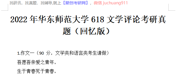 以上是聚创考研网为考生整理的"2022年华东师范大学618文学评论考研真题(回忆版)"的相关考研信息,希望对大家考研备考有所帮助! 备考过程中如有疑问,也可以添加老师微信juchuang911进行咨询。